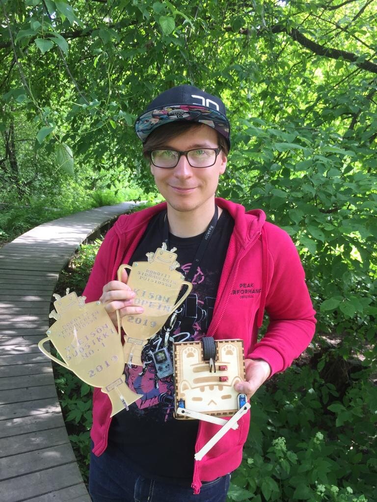 Once again, I took part in Hacklab.fi’s Robotit Strömbergin Puistossa robot building event and this time wanted to have something special: a maze robot with no traditional steering. This robot can only move forwards, but it has hands that can be used to push it away from walls. This worked surprisingly well and I ended up winning both the fastest time and audience’s favourite competitions!