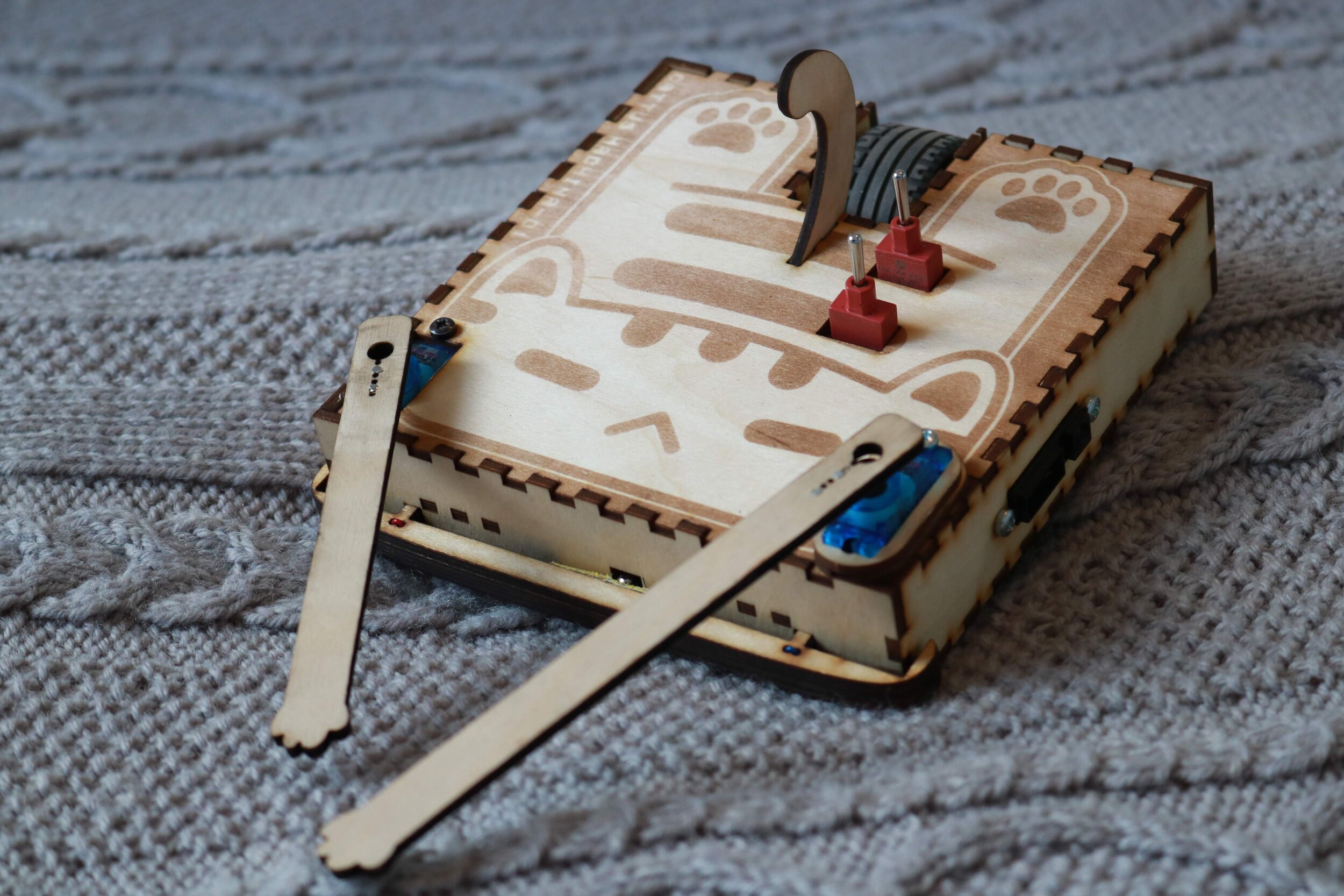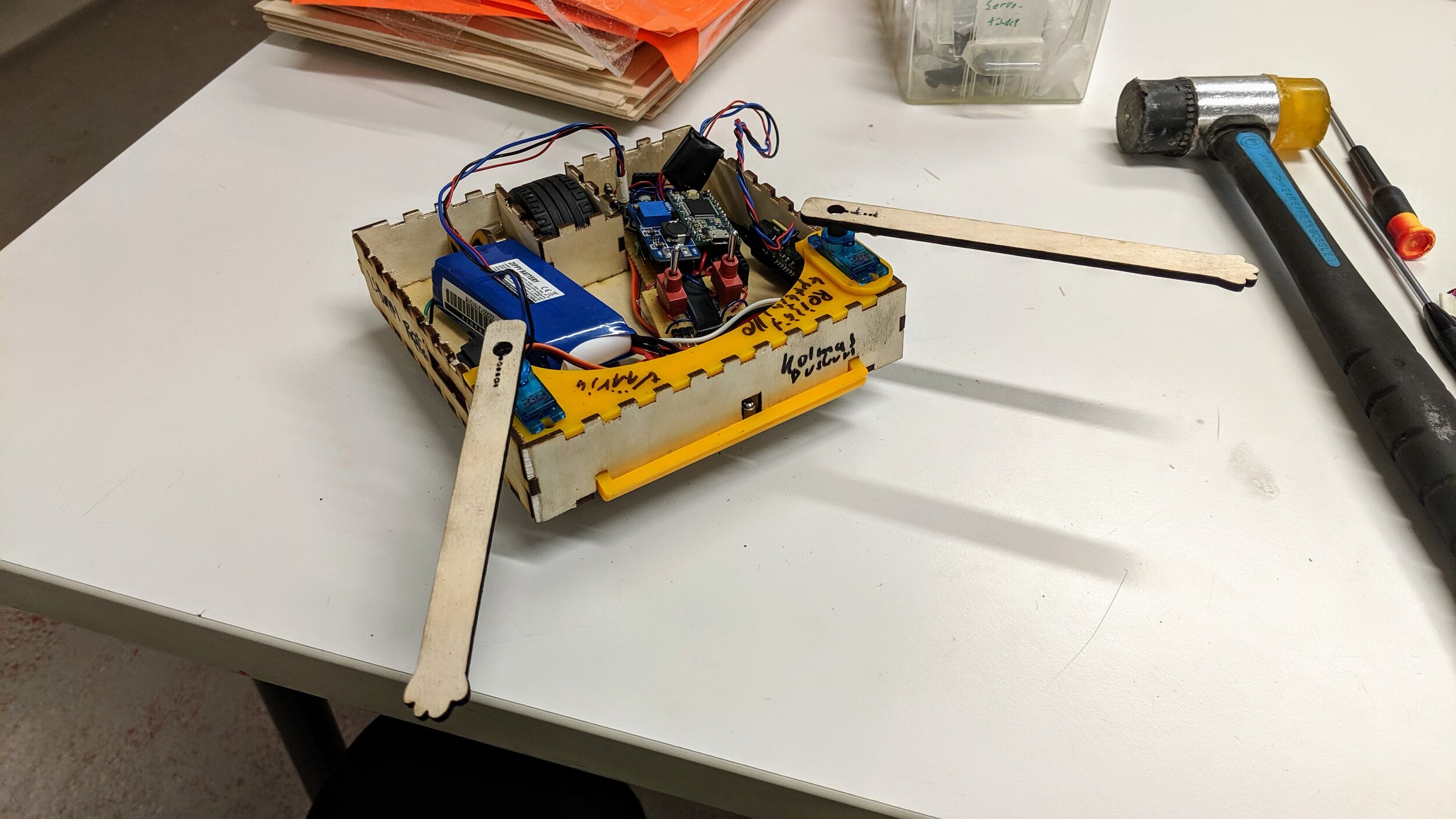 For the electronics, I reused my 2018 robot’s components. It had trouble moving the other wheel both directions reliably, but thankfully I only had one wheel to spin this time. Previously I had two servo-connectors just for show (moving head and tail), but this time they controlled the most important parts of the robot: the hands. I also used the tested Sharp GP2Y0A41SK0F Proximity Sensors, had them only look left and right. The front was this time detected only with a bumper and a micro switch, thankfully I was able to hook it up to free connectors left free by the front proximity sensor. I built the enclosure from laser-cut wood, which I designed in Corel Draw and Affinity Designer. Some LEGO parts were used for the wheel and connecting it.