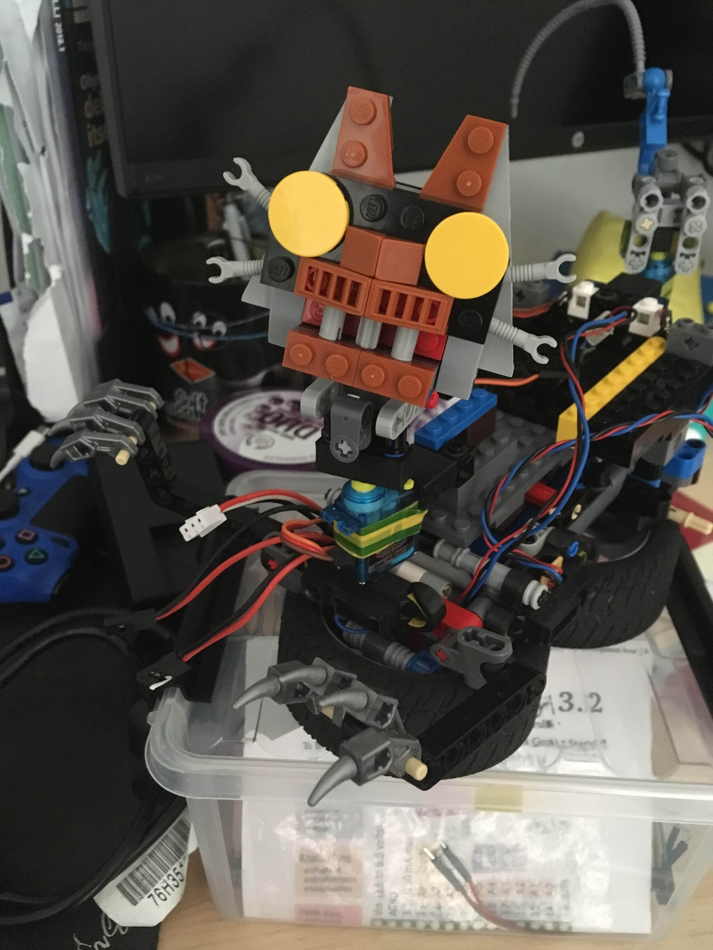 When looking for wheels to use, I realized that LEGO makes some of the best miniature wheels. While looking for the wheels, I also wanted to make the rest of the robot from LEGO. I used mostly LEGO Technic pieces, but 3d printed some adaptors to connect the motors and the sensors to LEGO Technic. That was a fun challenge and ended up working relatively well. Unfortunately I got carried away designing the rest of the robot with LEGO and it became much larger than expected with animated cat face and tail and some useless parts like front feet. In the race, the robot got stuck because of the extranous parts.