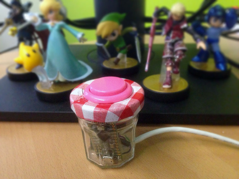 My keyboard at work doesn't have easy to use media controls, so I made my own. This simple one button jar works similar how Apple headphones work, one tap for play/pause, double tap for next track, triple tap for previous track and long press for stop. The code is written in Arduino and runs on Teensy-LC microcontroller. I used a Seimitsu PS 14 GN 30mm Arcade Button and it feels really nice to control my music with this simple gadget. As a case, I used a small jam jar for quirky appearance. The jar is made out of glass so the electronics can be seen from the outside.