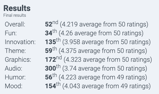 The game was quite succesful: We achived place 32 / 2204 in FUN category and 52 / 2204 in the OVERALL category of the Jam. I implemented support for online leaderboards with my Highscore server and some people got really competitive. The highest score was 1111 when second best was 305. I was personally able to achieve only 35 points and expected nobody to actulla break 100 point limit since the game was quite difficult.
