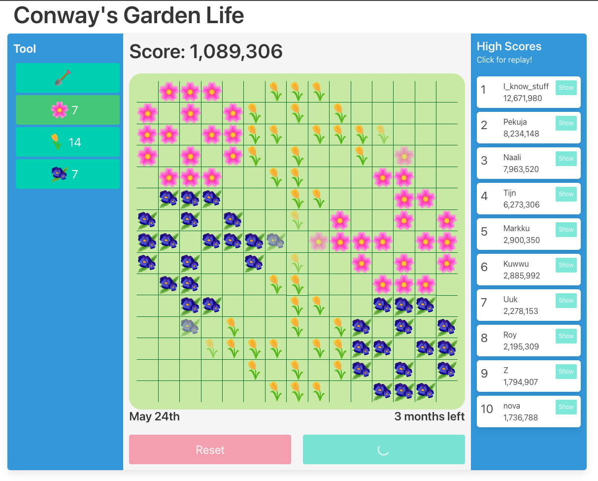 The server itself is quite simple Express web server with only a few API-endpoints exposed for the games. The scores are stored in PostgreSQL database. To prevent the most casual drive-by posting of arbitrary scores, the server implements a simple hash verification system based on score metadata and game specific secret. Every score entry can also contain some metadata to go with it. The Garden game uses the metadata field to store a replay of the game.